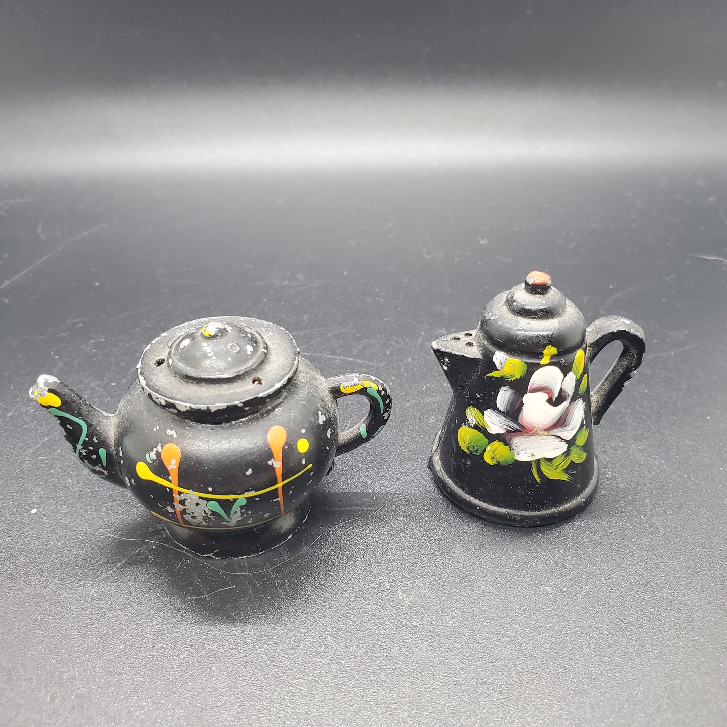 Vintage Black Cast Metal Handpainted Teapot and Kettle Salt and Pepper Shaker Set